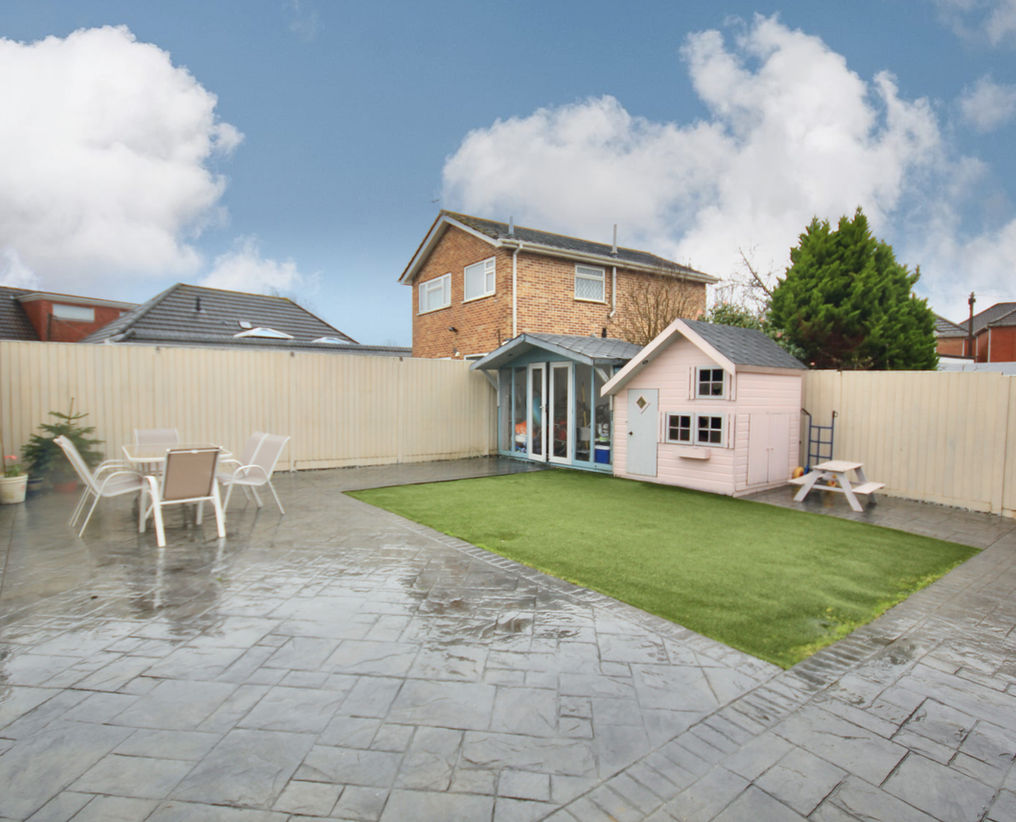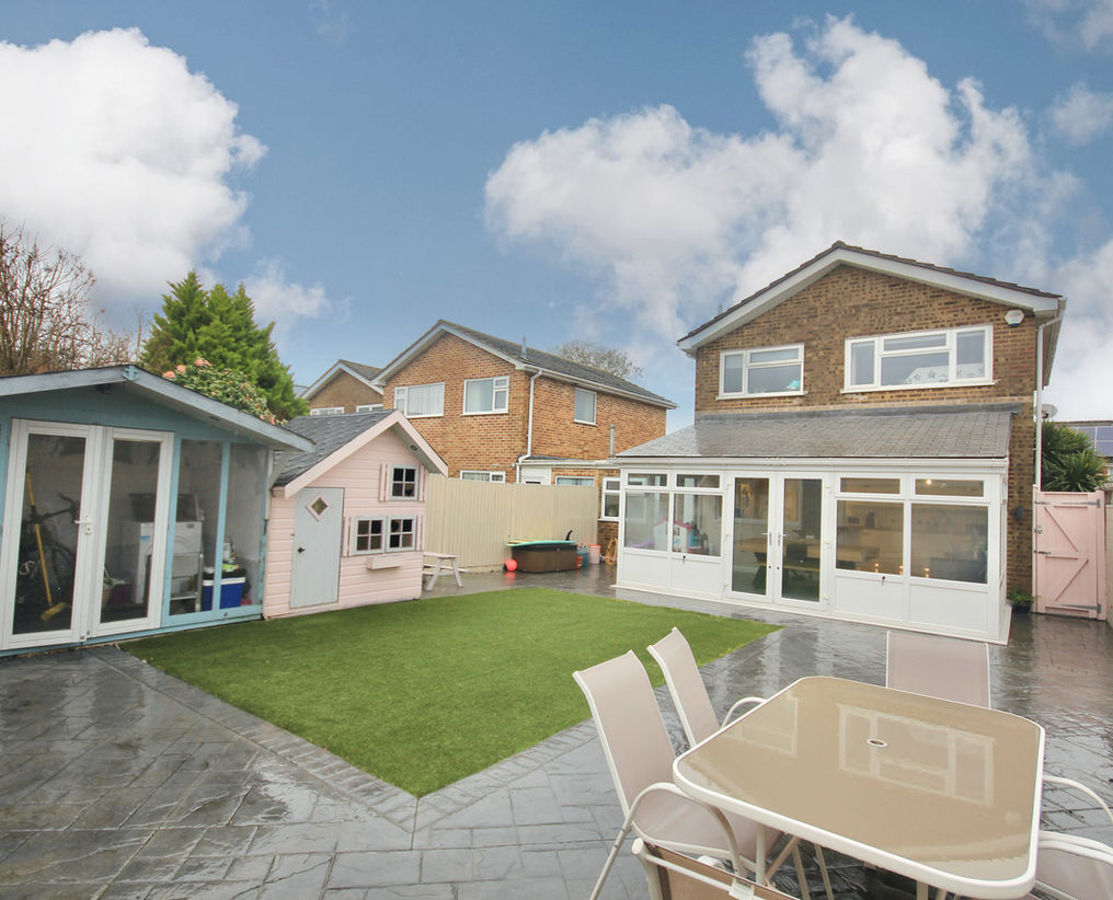 Externally, the rear garden enjoys a sunny south-easterly aspect. Designed for ease of maintenance, the garden is predominantly hard landscaped with artificial lawn and embossed concrete, creating an ideal outdoor space for relaxing and entertaining. The garden also houses a wendy house and further summerhouse complete with power and lighting.