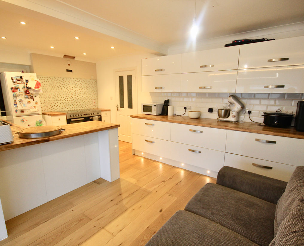 The kitchen truly is the heart of the home and is fitted with an extensive range of high-gloss wall and base units, complemented by wood work surfaces. The space enjoys an open-plan feel, flowing seamlessly into the conservatory, which overlooks the rear garden and benefits from French doors providing direct access outside.