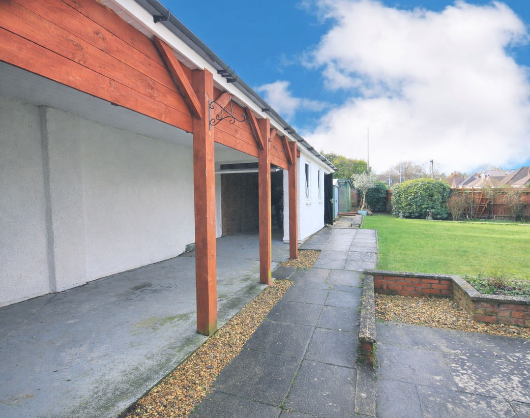 To the front and side, a secure gated driveway provides ample off-road parking for multiple vehicles, making it ideal for those with a campervan, boat, or caravan, and leads through the 23ft car port to the single detached garage, which benefits from a remote-controlled door, side access, light, and power.